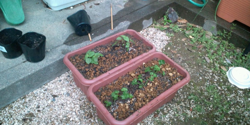 パセリとシソですが、どうやら種まきのときに土を被せ過ぎたようで、同じプランターへ苗を定植するのに掘り返してたら発芽したものが出てきました・・・