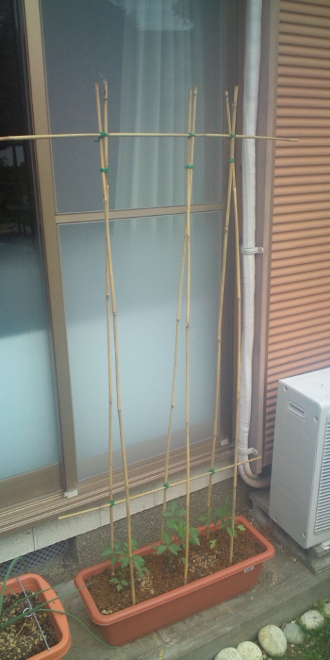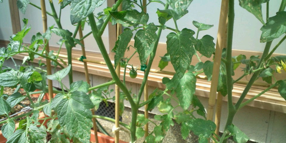プチトマトは二段目の花が咲き、一段目に実がなってきたよ。