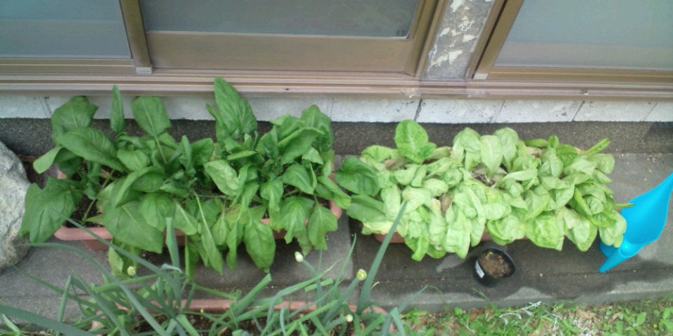 ほうれん草とサラダ菜は豊作やけど、旅行に出てて水やれなかったので少し萎びてるね。
