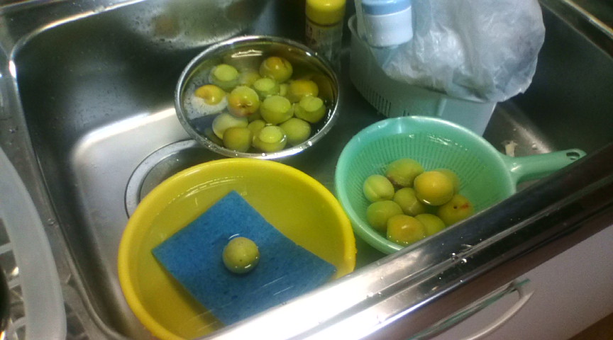 まずは買ってきた梅を水で洗いながら残っているヘタを取る。